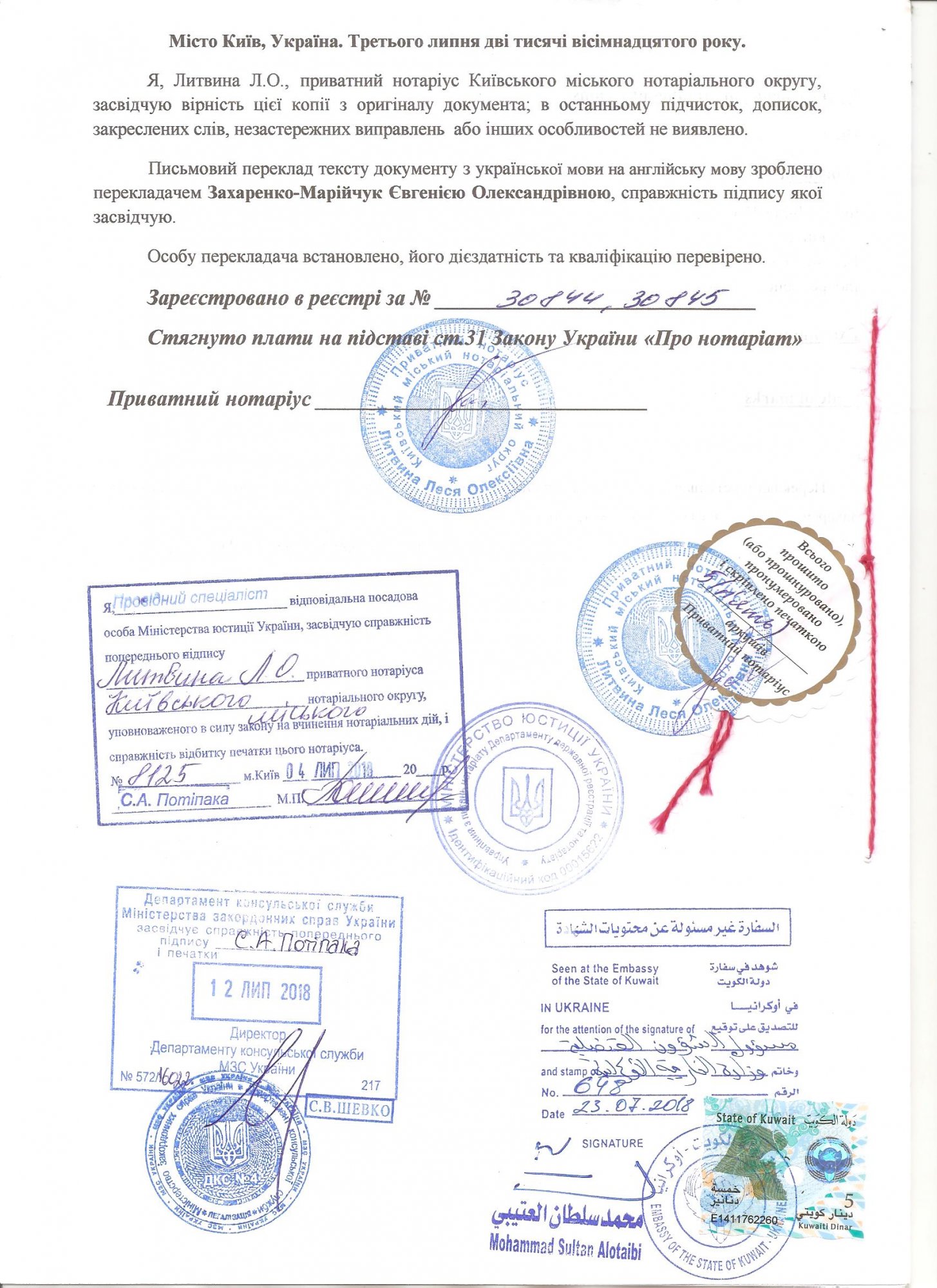 4) After the above actions, the document can be submitted for the final stamp of legalization to the Embassy of Kuwait in Ukraine. The consular fee is paid.